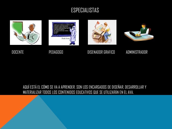 - 3. ESPECIALISTASDOCENTE PEDAGOGO DISENADOR GRAFICO ADMINISTRADOR AQUÍ ESTÁ EL CÓMO SE VA A APRENDER. SON LOS ENCARGADOS DE DISEÑAR, DESARROLLAR Y MATERIALIZAR TODOS LOS CONTENIDOS EDUCATIVOS QUE SE UTILIZARÁN EN EL AVA.