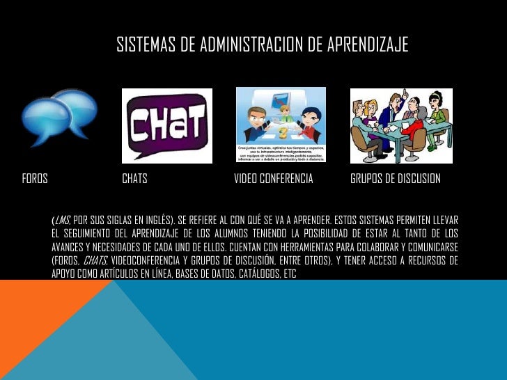 - 4. SISTEMAS DE ADMINISTRACION DE APRENDIZAJEFOROS CHATS VIDEO CONFERENCIA GRUPOS DE DISCUSION (LMS, POR SUS SIGLAS EN INGLÉS). SE REFIERE AL CON QUÉ SE VA A APRENDER. ESTOS SISTEMAS PERMITEN LLEVAR EL SEGUIMIENTO DEL APRENDIZAJE DE LOS ALUMNOS TENIENDO LA POSIBILIDAD DE ESTAR AL TANTO DE LOS AVANCES Y NECESIDADES DE CADA UNO DE ELLOS. CUENTAN CON HERRAMIENTAS PARA COLABORAR Y COMUNICARSE (FOROS, CHATS, VIDEOCONFERENCIA Y GRUPOS DE DISCUSIÓN, ENTRE OTROS), Y TENER ACCESO A RECURSOS DE APOYO COMO ARTÍCULOS EN LÍNEA, BASES DE DATOS, CATÁLOGOS, ETC
