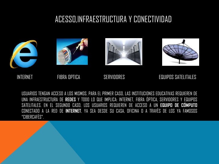 - 5. ACESSO,INFRAESTRUCTURA Y CONECTIVIDADINTERNET FIBRA OPTICA SERVIDORES EQUIPOS SATELITALES FINALMENTE, SE REQUIERE DE UNA INFRAESTRUCTURA TECNOLÓGICA PARA ESTOS SISTEMAS DE ADMINISTRACIÓN DE APRENDIZAJE, ASÍ COMO PARA QUE LOS USUARIOS TENGAN ACCESO A LOS MISMOS. PARA EL PRIMER CASO, LAS INSTITUCIONES EDUCATIVAS REQUIEREN DE UNA INFRAESTRUCTURA DE REDES Y TODO LO QUE IMPLICA: INTERNET, FIBRA ÓPTICA, SERVIDORES Y EQUIPOS SATELITALES. EN EL SEGUNDO CASO, LOS USUARIOS REQUIEREN DE ACCESO A UN EQUIPO DE CÓMPUTO CONECTADO A LA RED DE INTERNET, YA SEA DESDE SU CASA, OFICINA O A TRAVÉS DE LOS YA FAMOSOS “CIBERCAFÉS”.